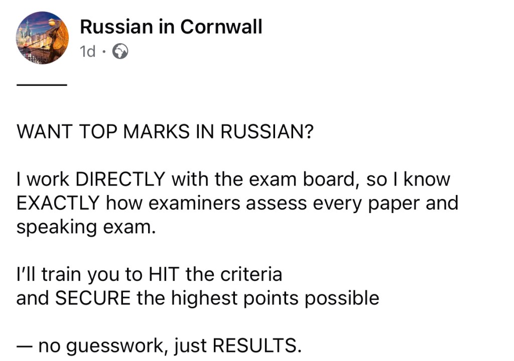 I first began teaching Russian as an extracurricular activity at Trent College in Derbyshire. Now, I support students in their preparations for Russian GCSE and A-level exams and conduct the speaking component at schools and colleges across Devon and Cornwall.